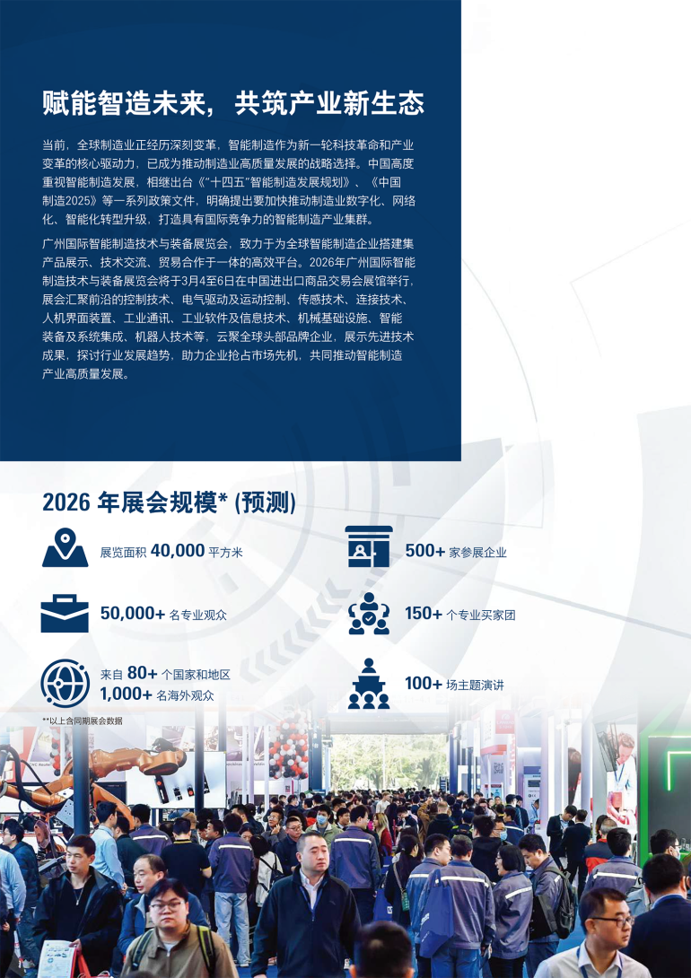 广州国际智能制造技术与装备展览会,致力于为全球智能制造企业搭建集产品展示、技术交流、贸易合作于一体的高效平台。2026年广州国际智能制造技术与装备展览会将于3月4至6日在中国进出口商品交易会展馆举行展会汇聚前沿的控制技术、电气驱动及运动控制、传感技术、连接技术人机界面装置、工业通讯、工业软件及信息技术、机械基础设施、智能装备及系统集成、机器人技术等,云聚全球头部品牌企业,展示先进技术成果,探讨行业发展趋势,助力企业抢占市场先机,共同推动智能制造产业高质量发展。