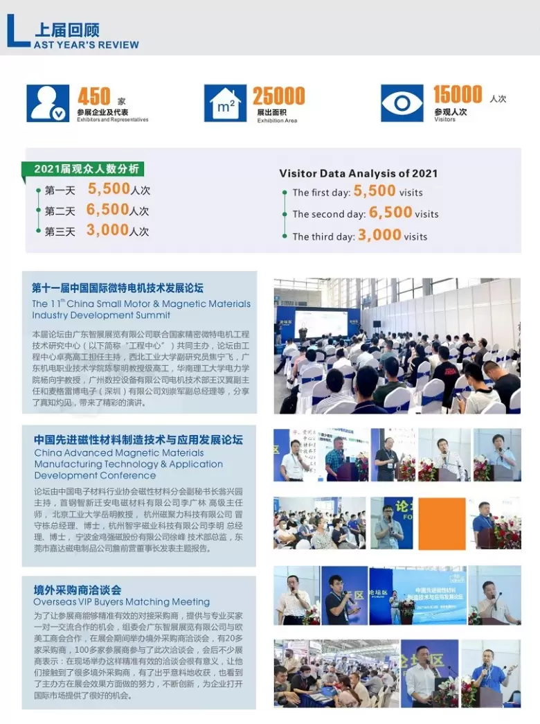 深圳国际小电机及磁性材料展览会Motor & Magnetic Expo上届展会总面积15000平方米,参展企业400家均来自日本、韩国、印度、俄罗斯、美国、印尼、中国香港等,参展人数达20000人。同期还举办了微特电机行业技术及发展论坛,非晶合金粉末新技术,新工艺国际交流研讨会,电机人沙龙等多场高端同期活动。此次论坛邀请到学术界和企业界的众多专家、学者和企业家累计超过1000人次,会与展紧密相结合,为行业提供更多的交流、贸易、展示平台,加快和促进电机磁性材料行业向高质量方向发展。