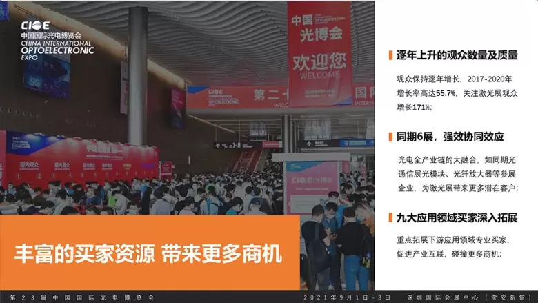 深圳红外技术及应用展(CIOE)同期举办中国光博会CIOE,紧贴市场发展,细分观众数据实现精准营销匹配资源,展示前沿智能制造技术及创新综合解决方案。覆盖光通信、激光、红外、精密光学、光电创新、军民融合、光电传感、数据中心等光电产业链版块。