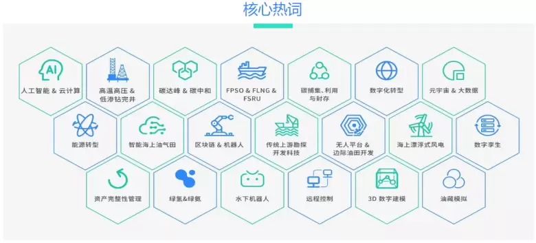 边际油田开发、浮式生产技术、水下生产系统、钻井和钻机、数字化、无人化&少人化平台、漂浮式海上风电、水下生产系统、绿氢&绿氨