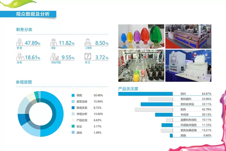 上海国际染料工业及有机颜料、纺织化学品展CHINA INTERDYE上届展会总面积40000平方米,参展企业620家,参展人数达50000人。展会还设有各种行业协会会议和研讨会,参展商的技术交流会,影响力极广。